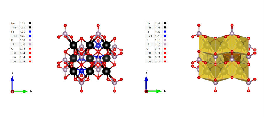 For NaFePO4, the olivine phase can only exist stably below 480 ℃, while its thermodynamically stable phase belongs to the phosphate iron sodium ore phase when the temperature exceeds 480 ℃. As shown in the above figure, the NaFePO4 with olivine structure belongs to the orthorhombic crystal system, with a spatial group of Pmnb. The crystal is composed of FeO6 octahedra and PO4 tetrahedra, forming a spatial framework. Na+occupies a common octahedral position and forms long chains along the b-axis direction. One FeO6 octahedron shares an edge with two NaO6 octahedrons and one PO4 tetrahedron, while the PO4 tetrahedron shares an edge with one FeO6 octahedron and two NaO6 octahedrons. Sodium ions have one-dimensional transport channels, and during the charging and discharging process, sodium ions can easily detach/embed without damaging the main structure. NaFePO4 has also been widely studied and applied as a positive electrode sodium storage material in sodium ion batteries. Setting the charging and discharging range in organic systems to the same voltage range as stable charging and discharging in water results in better polarization and rate performance of NaFePO4 in aqueous batteries. This may be related to the superior ion conductivity and interface impedance of water compared to organic systems. Therefore, it can be considered that olivine type NaFePO4 is more suitable as the positive electrode material for aqueous sodium ion batteries. 2. Pyrophosphate type polyanionic compounds obtained by replacing phosphate ions with pyrophosphate ions are widely used in lithium-ion batteries, and the same research approach can also be applied to sodium ion batteries. Sodium based pyrophosphate materials are mainly divided into two categories: NaMP2O7 (M=Ti, V, Fe) and Na2MP2O7 (M=Fe, Mn, Co), and each material may have multiple crystal types at the same time. For example, NaMP2O7 contains various structures such as triclinic, monoclinic, or tetragonal, all of which can provide channels for Na+migration. When used as the positive electrode for sodium ion batteries, excess raw materials can prepare sodium rich structures. Therefore, even without carbon coating and nanoscale structures, this material can exhibit good electrochemical performance compared to other phosphate materials. 3. Sulfate type polyanionic compounds have stronger electronegativity than phosphate ions. Therefore, using sulfate ions to replace phosphate ions can improve the working voltage of the material as the positive electrode of sodium ion batteries. In NaMSO4F materials, M can also be transition metal compounds such as Ni and Co, which share the common feature of improving the low operating voltage and low conductivity of fluorophosphates to a certain extent. In future research, various transition metal based polyanionic compounds incorporating sulfate ions will play an important role.